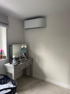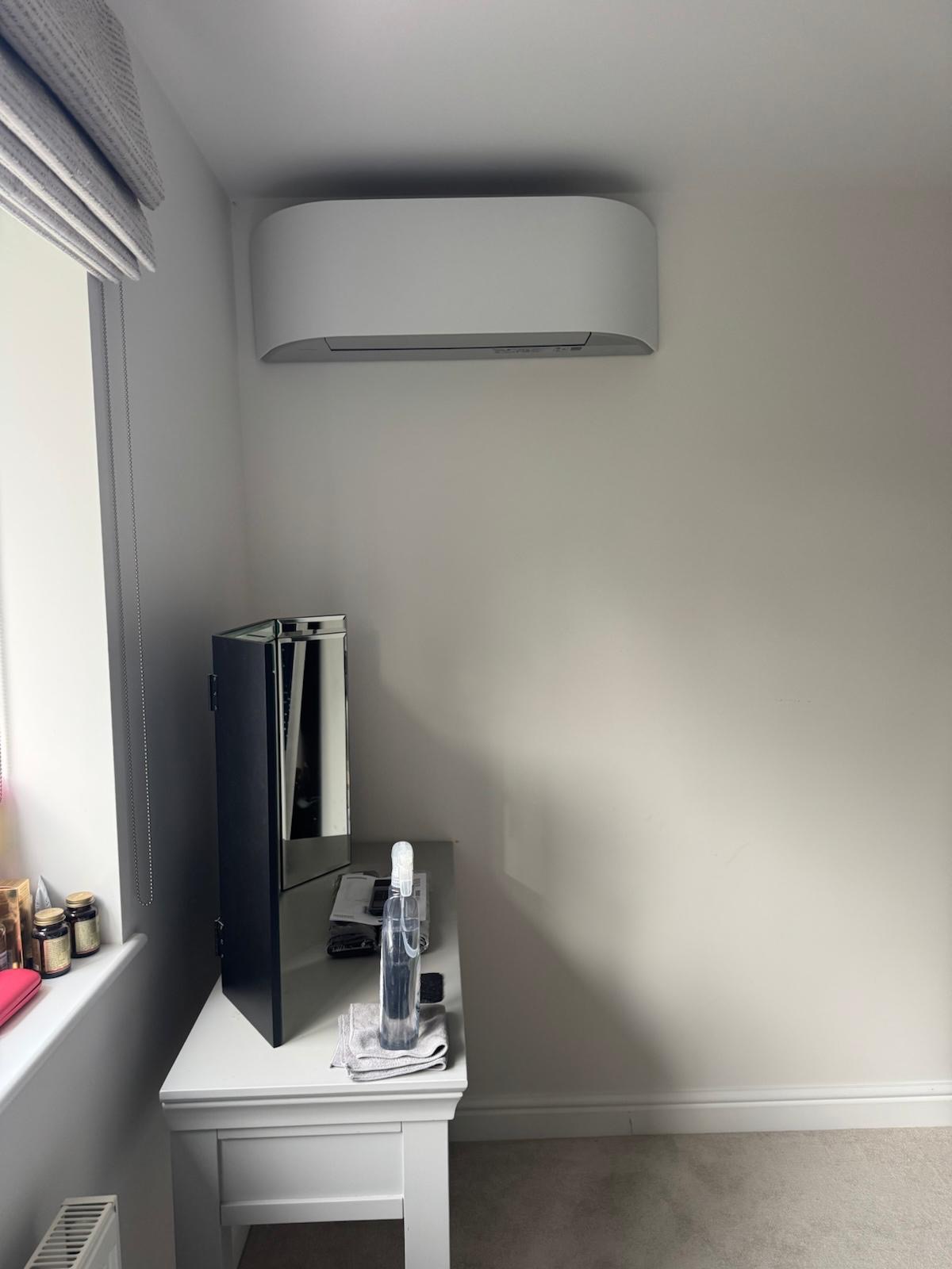 We proposed to fit two Toshiba Haori wall mounted units, both connected to one multi-split outdoor unit. The outdoor unit was mounted on wall brackets at low level on the first floor in a discreet location above a flat roof and which was not visible from the garden. The two Haori looked fantastic on both bedrooms, with our client deciding to leave the units without the grey fabric fascias!